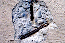Die Lösung: Rostende Eisen werden frei gelegt, gereinigt und metallisch blank entrostet. Auftrag einer Alkalisilikatlösung, 2-facher Auftrag von Rostschutz. Vorschlämmen der Schadstellen und mit speziellem Reparaturmörtel angleichen an die umgebende Betonfläche.